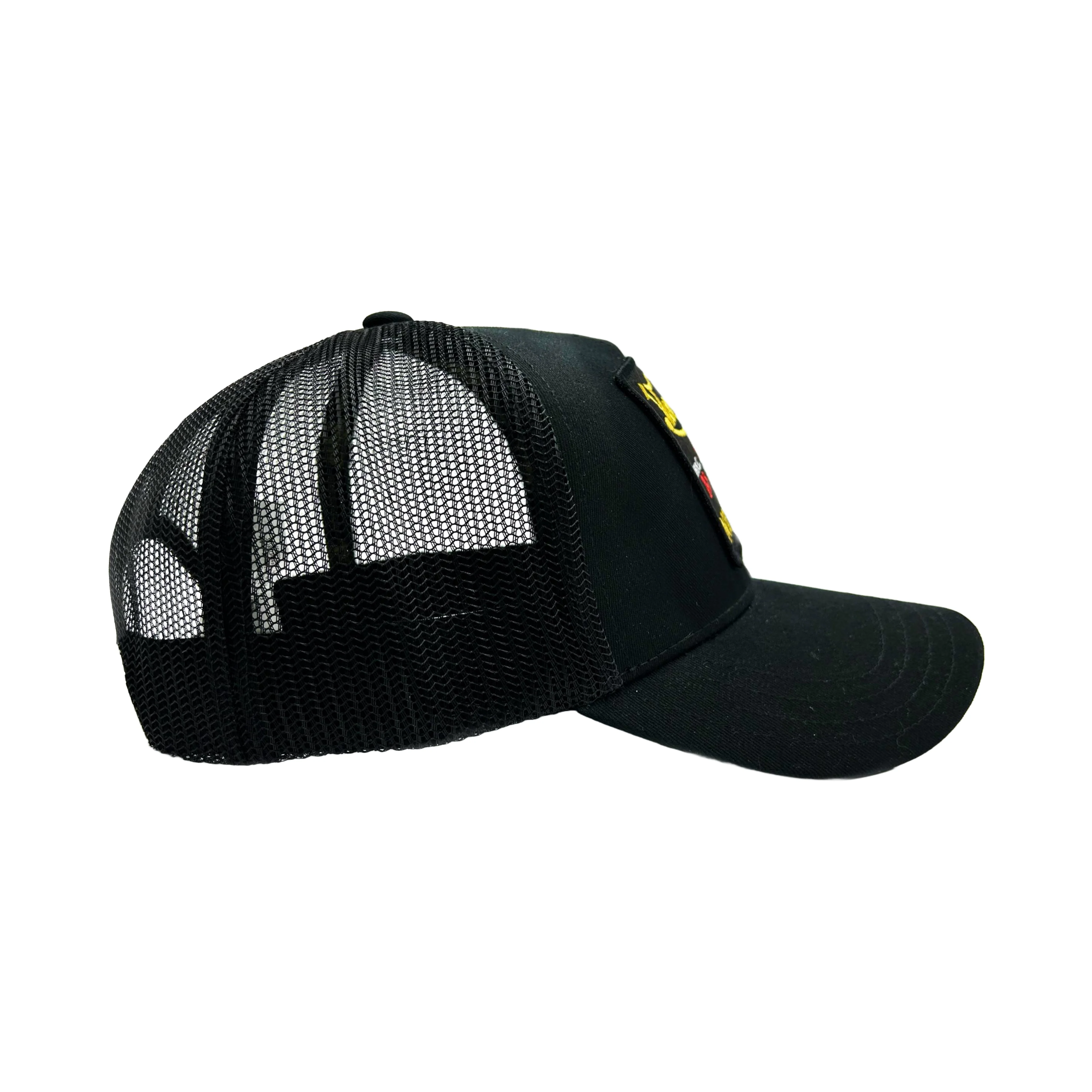 This Classic Snap back Trucker Hat by Von Dutch in Black with a yellow Motorcycles Patch. Features the iconic logo patch on front, black breathable mesh rear, and an adjustable snap back panel. All head wear sales are final.